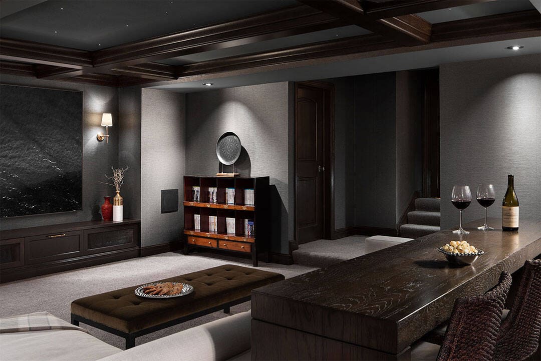 The project scope was to renovate the Master Suite, the upper level bathrooms, and create a Recreational area and Media Room at the lower level.Design themes were implemented on each level: Arched doorways and cased openings; floating cabinetry; sophisticated wall coverings; and unique lighting elements including household lighting controls for varied mood experiences.
