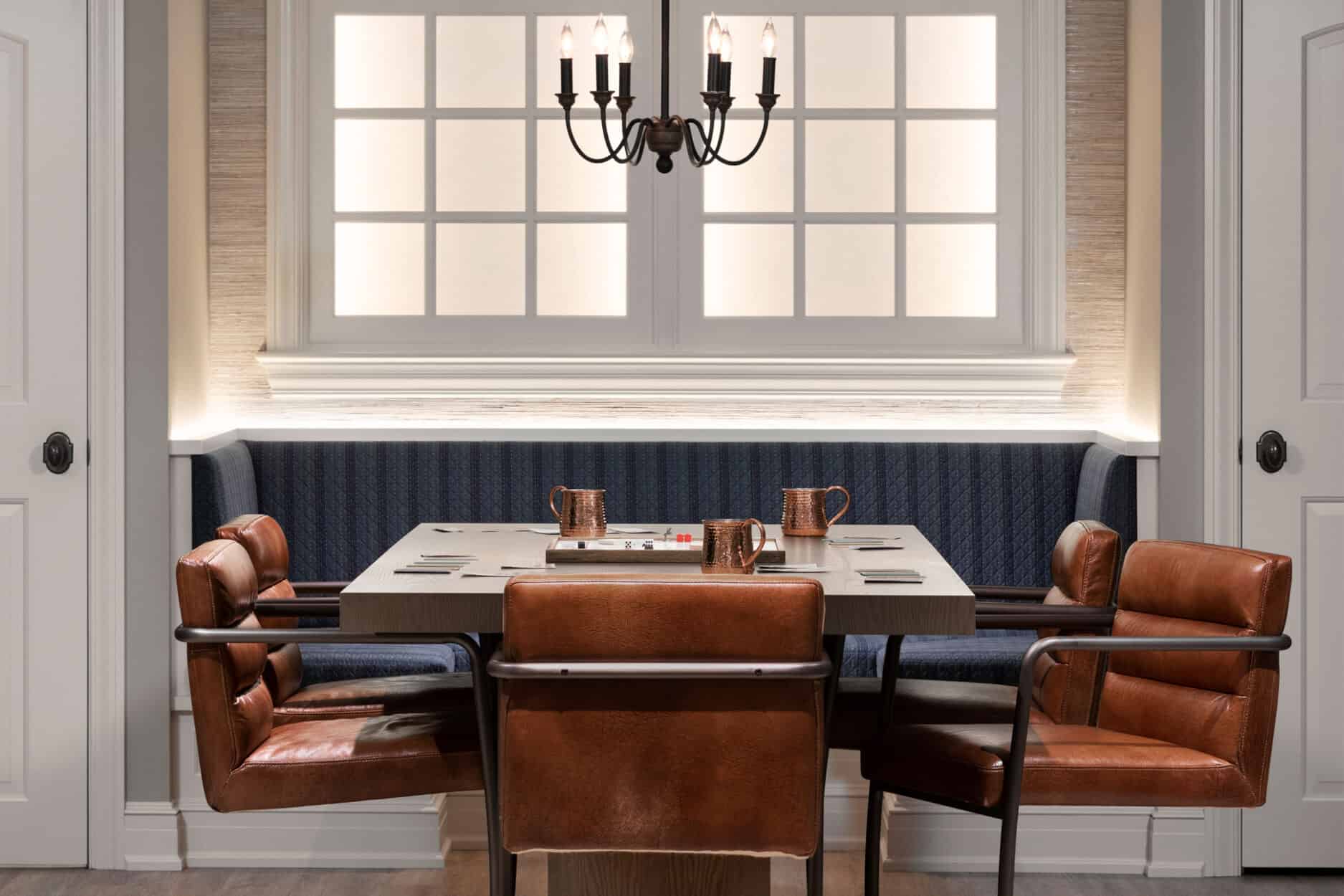 Updating the main level Master Suite began with recognizing the En Suite was undersized and inefficient relative to the scale of the home. The Bedroom and Closet were also in need of improvement. Window locations were changed to reorient the bed, creating improved Feng Shui, and beam work and lighting enhanced the existing tray ceiling. Arched openings frame the Shoe Closet designed with glass doors and silver leaf wallpaper, creating separation from the enlarged Dressing Room.The barrel-vaulted ceiling in the Bathroom addition culminates at the freestanding tub before an arched window. The makeup vanity, flanked by tall cabinets, provides an area to style for the day. A center cabinet grounds two floating vanities appointed with medicine cabinets designed into a custom backsplash detail.In the Dining Room, silver metallic backed grass cloth and new wainscot transformed the existing fuchsia walls that distracted from a formal dining experience. The dining table, upholstered seating, window treatments, and area rug were custom selections to provide a transitional style.Upstairs, two en suites were in need of updates, and a third was added into unused attic space. Again, floating cabinetry and arched openings were consistent design features. Faux skylights create an element of natural light in these under roof baths. In Bath #2, expansion into existing attic space allowed for the addition of a soaking tub, which organized the room into three zones. In Bath #3, pocket doors replaced swinging doors for better function. Expansion into a bedroom provided space for floating vanities and a larger shower. The connection was simplified to the added Bath #5 with a hallway where a mirror conceals attic access. The cement tile compliments existing wallpaper in the bedroom.The lower level transformed into a Gaming and Lounge area, Media Room, Powder Room, and Exercise Room. A Scrabble board surrounded by swivel chairs provides a unique way to host game night. New ceiling beams and arched cased openings separate the Lounge from the Game area. The custom Banquette’s faux window anchors the space and illuminates the room.In the Media Room and Powder Room, a darker stain creates an elegant and moody style. A coffered ceiling conceals structural beams and features a fiber optic lighting element. Textured wallpaper and sconces elevate this sophisticated theatre. The Powder Room’s metallic patterned wallpaper plays off the gold fixtures, sconces, and tile floor. The floating vanity matches the style now found throughout the home.The design concept pays tribute to the home’s French Traditional features, while reflecting the homeowner’s desire for a cleaner transitional aesthetic. The striking results of this basement remodel brought new life to a previously seldom used space, making it a family favorite.