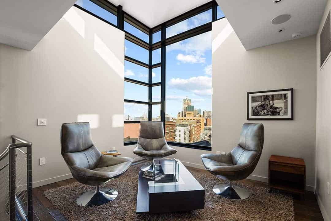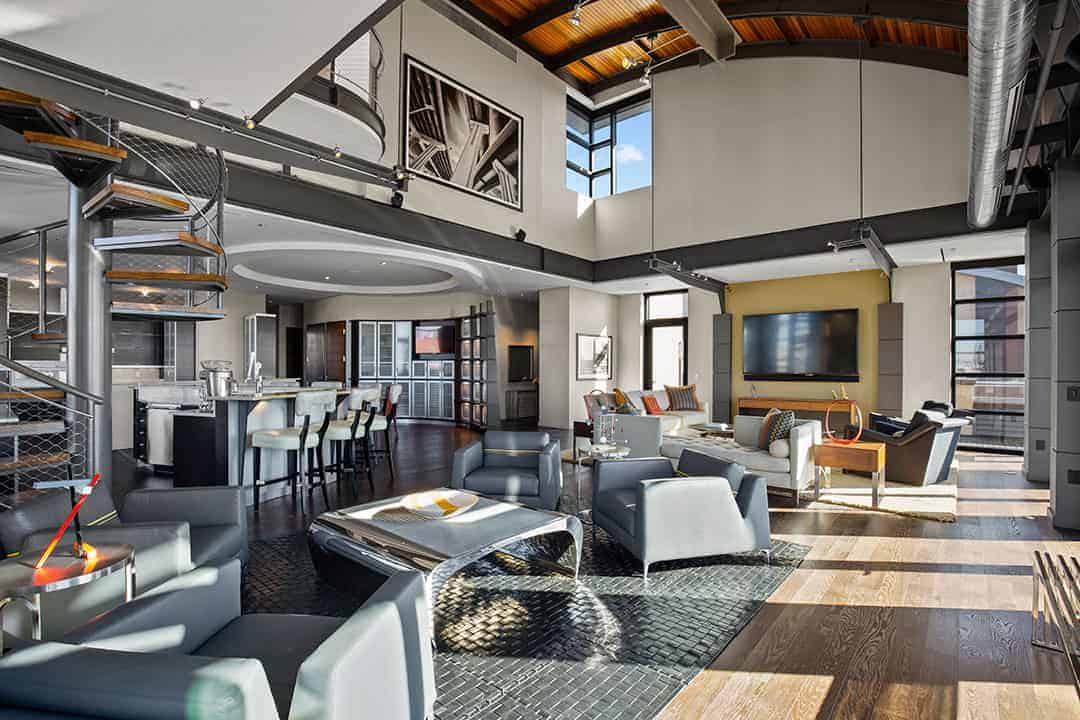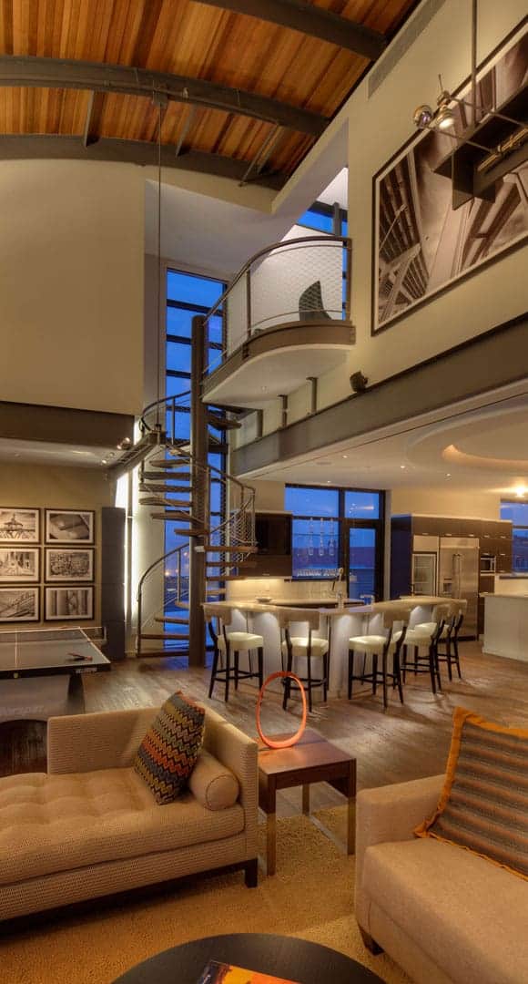 The highlight of the design is a large open entertainment concept whose plan incorporates a media rich environment utilizing multiple media screens viewable from all locations, including an oversized 90” LED TV at the Living Room. Further enhancements include a Ping Pong Area with adjacent lounge seating, a full Beverage Bar including a personalized beer dispenser, full-size beverage refrigerator, and curvilinear bar seating. A complete gourmet Kitchen and adjacent circular Dining Area support and complement the exciting entertaining experience. The ambiance is defined by the curved, vaulted, wood ceiling with metal beams, columns, and basketry. A custom spiral stair leads to a private mezzanine seating area with an indoor fire table. Floor to ceiling windows beckon the details of the cityscape and tower above the river walk below. Hand scraped wide plank wood floors, along with oversized urban art, complete the modern warehouse urban concept. Two Bedroom Suites with Walk-In Closets, a dedicated Laundry/Mudroom, and a separate, private entry complete the Guest experience.
