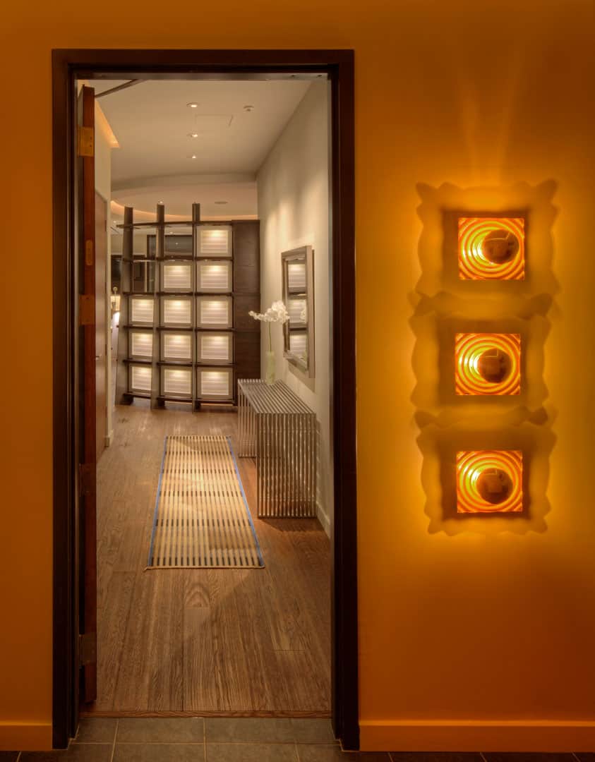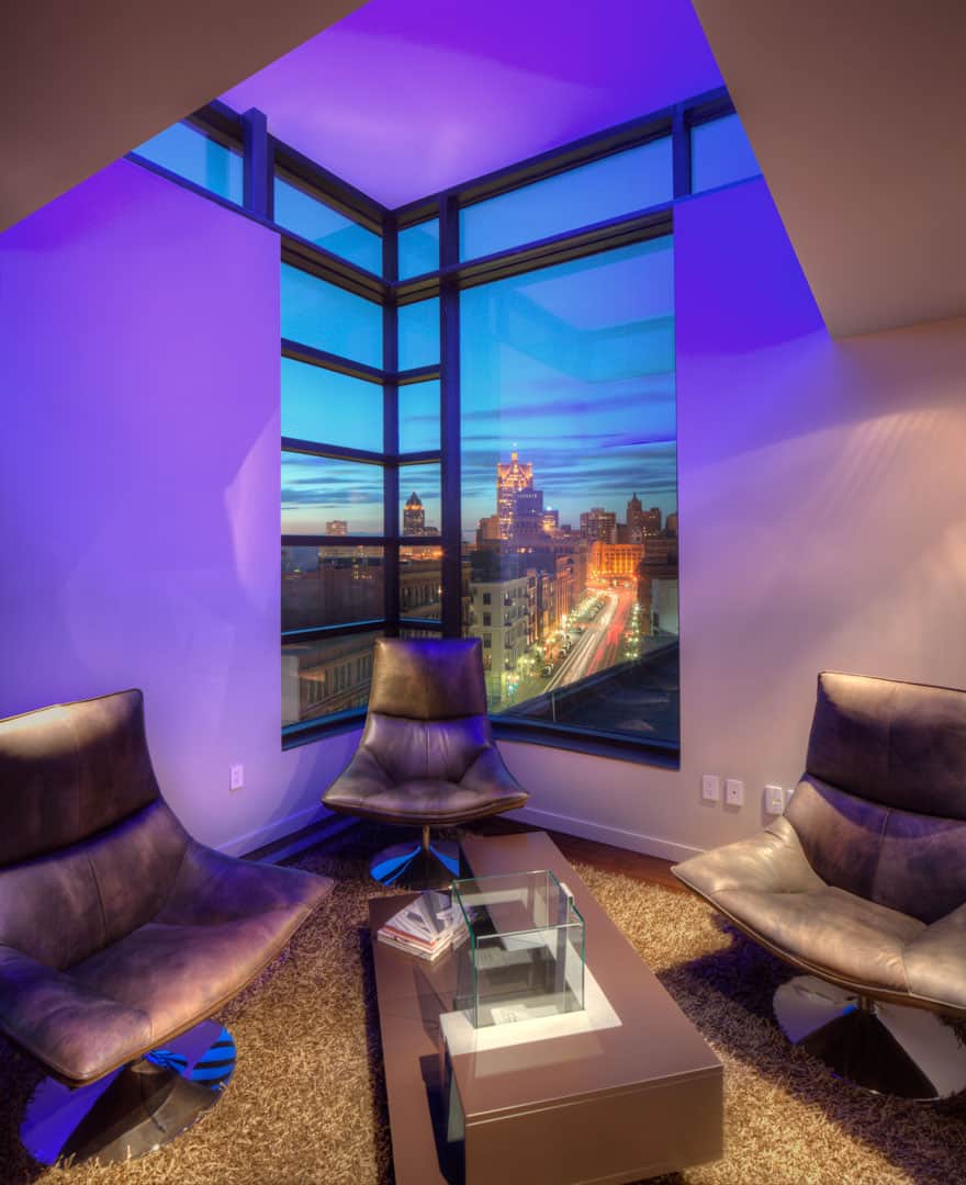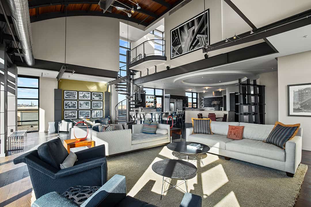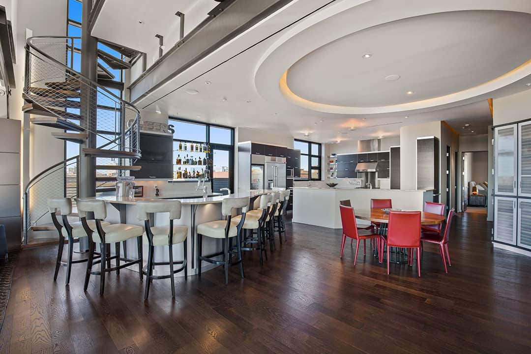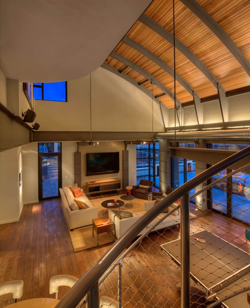 The highlight of the design is a large open entertainment concept whose plan incorporates a media rich environment utilizing multiple media screens viewable from all locations, including an oversized 90” LED TV at the Living Room. Further enhancements include a Ping Pong Area with adjacent lounge seating, a full Beverage Bar including a personalized beer dispenser, full-size beverage refrigerator, and curvilinear bar seating. A complete gourmet Kitchen and adjacent circular Dining Area support and complement the exciting entertaining experience. The ambiance is defined by the curved, vaulted, wood ceiling with metal beams, columns, and basketry. A custom spiral stair leads to a private mezzanine seating area with an indoor fire table. Floor to ceiling windows beckon the details of the cityscape and tower above the river walk below. Hand scraped wide plank wood floors, along with oversized urban art, complete the modern warehouse urban concept. Two Bedroom Suites with Walk-In Closets, a dedicated Laundry/Mudroom, and a separate, private entry complete the Guest experience.