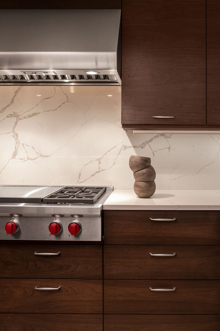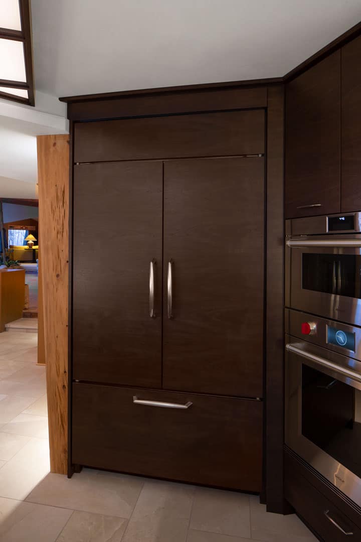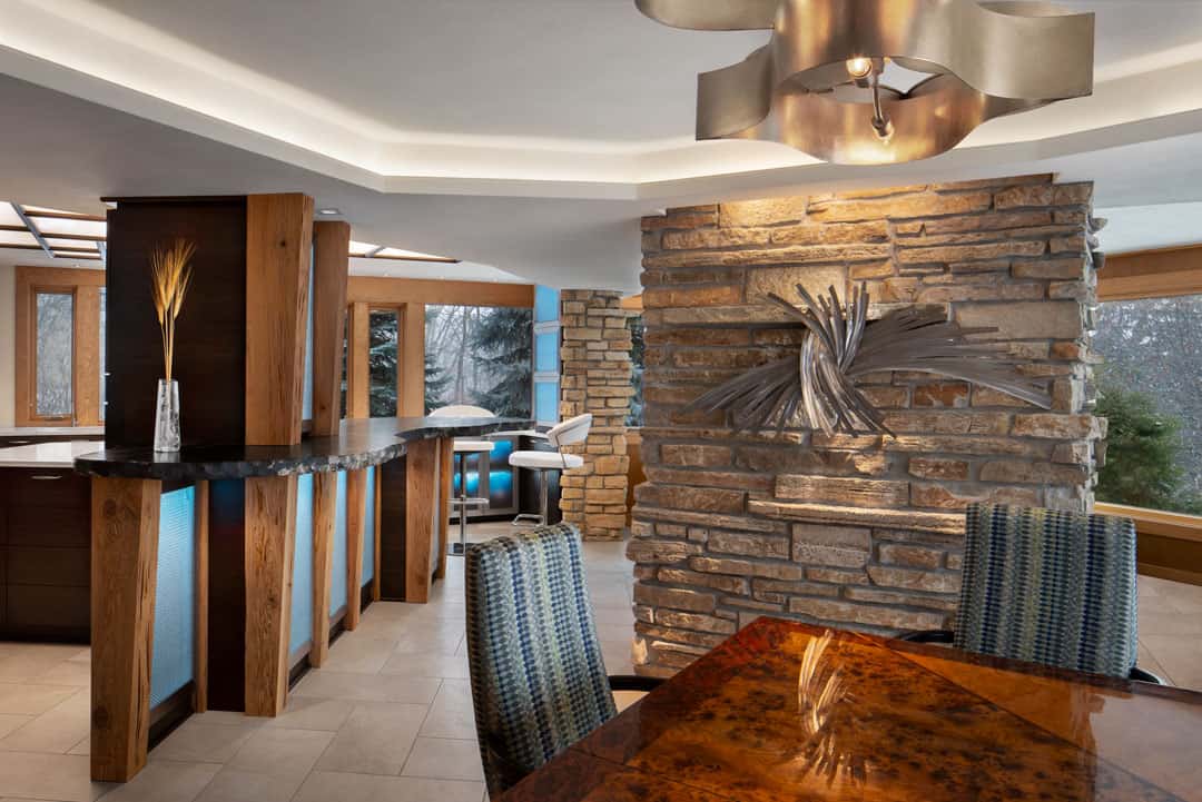 The design of the kitchen (and beyond) needed to respect the style of the home and existing finishes. Following Wright’s lead: fire became the “heart of the home” by adding a fireplace, pecky cypress and Lannon stone were repeated, and strong horizontal lines of stained walnut cabinetry and soffited light coves were crafted. The herringbone pattern of the floor tile echoed the pattern of the existing flooring and angles of the floorplan.