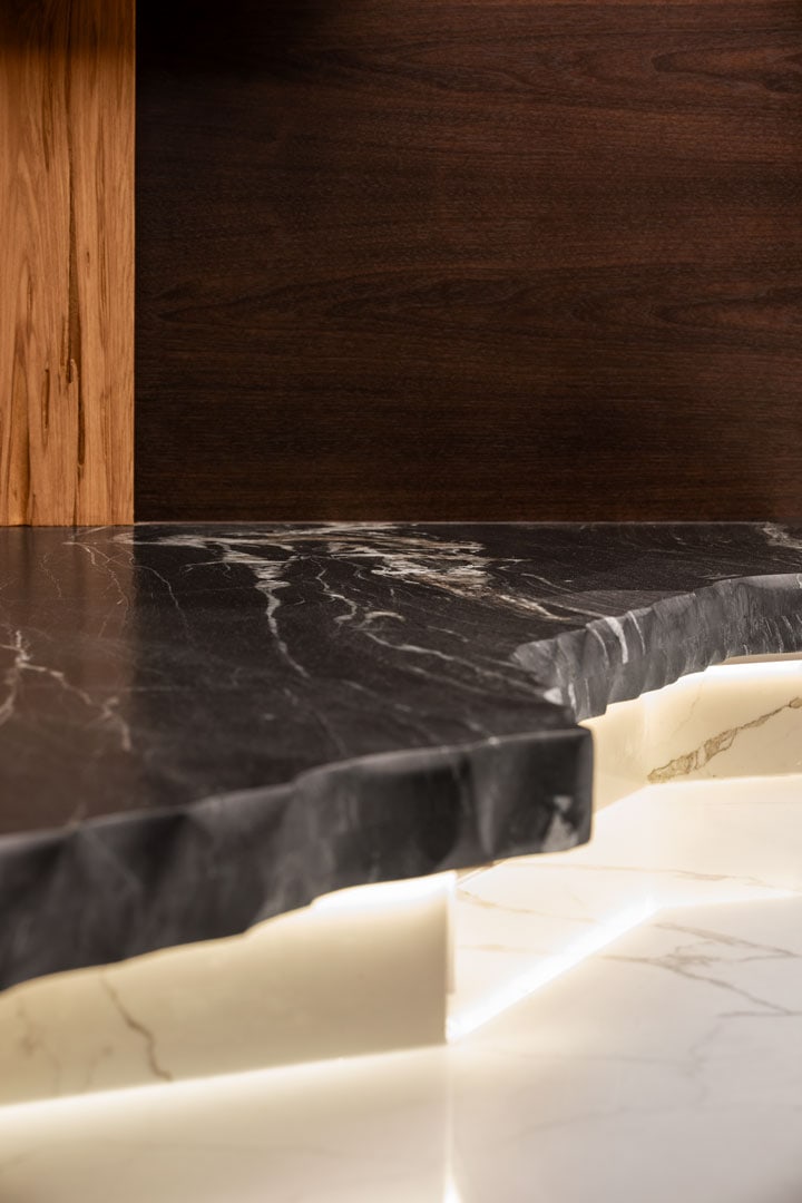 Astute space planning that incorporated existing structural elements was essential to ensure a functional kitchen and entertainment area. The existing barriers were diminished by removing walls and reimagining how the spaces fit together.