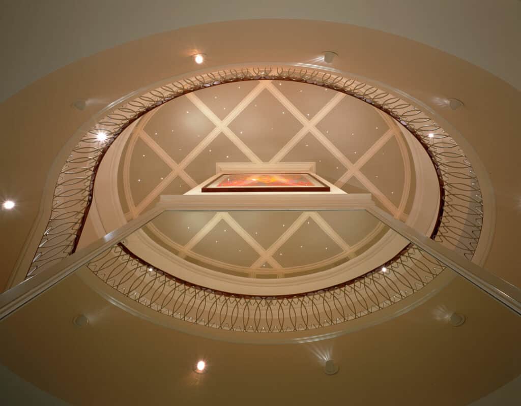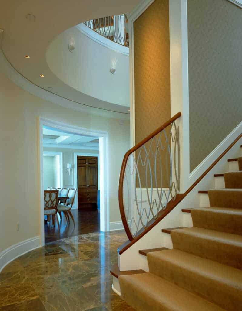 A refined design detail was expressing the elliptical pattern of the custom stair rail in this high rise penthouse. The transitional style embodies the owner’s vision for a clean aesthetic. The design seamlessly merges architecture and interiors to create a cohesive environment that invites family and friends to gather in comfort, surrounded by custom-designed details and finishes.