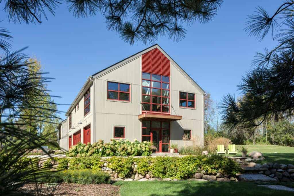 The design expands guest accommodations and entertainment options beyond the main house. The building’s simple, clean lines integrate into the natural rural environment while providing modern conveniences.