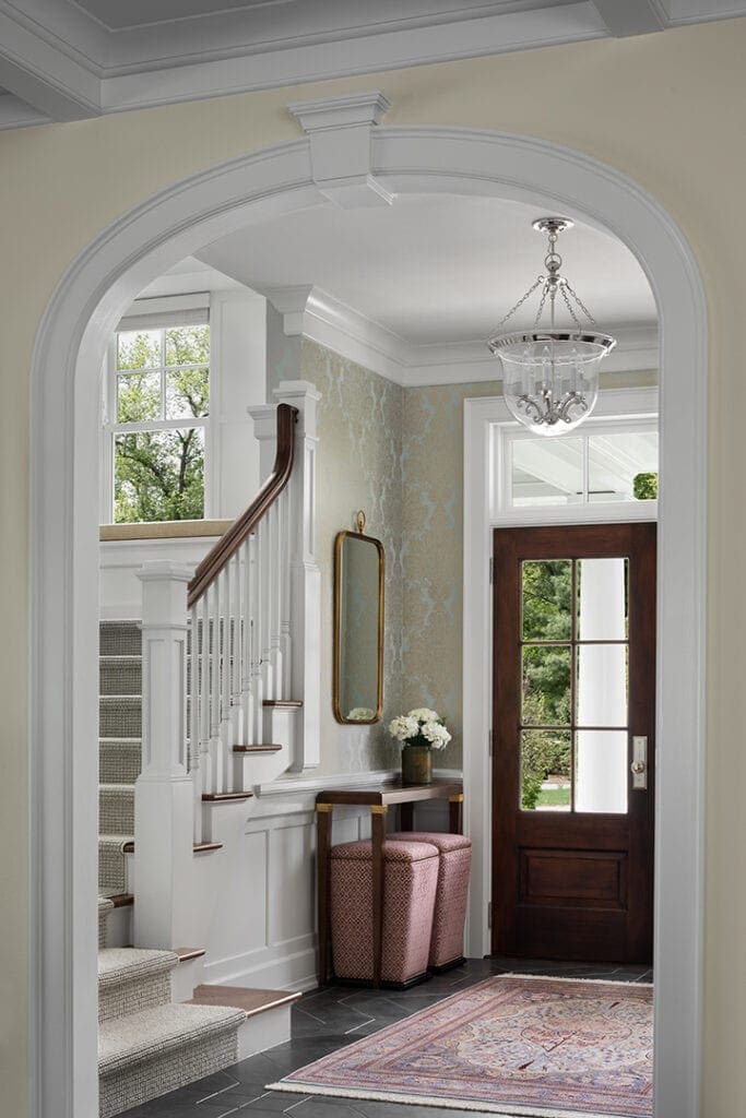 The foyer sets a formal tone with a traditional paneled wainscot. Natural light floods the space through the entry doors and transom window. Further energizing the space, a damask patterned wallcovering with a shimmery metallic gold print, reflects the natural light. A wide, formal staircase is eased with a window seat at the landing’s turn. Natural stone flooring brings down the formality and adds a sense of balance for a sensible family lifestyle.