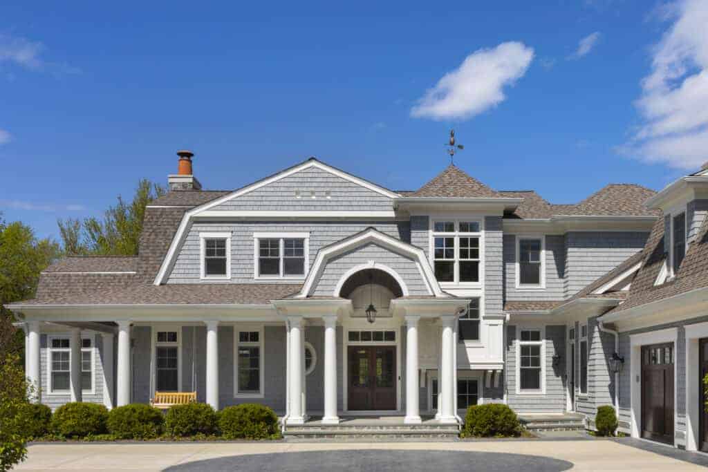 This Shingle Style design is reminiscent of coastal waterfront homes. The Dutch Colonial architecture features an arched, covered porch for a welcoming entry. This sets the rhythm for the arched, cased openings throughout the house that define and connect the spaces while maintaining sight lines in an open floorplan.
